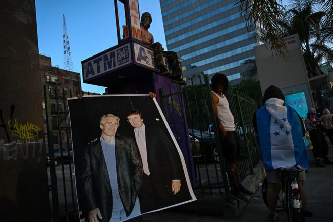 6月11日,在洛杉矶潘兴广场附近,一名抗议者举着被定罪的性犯罪者杰弗里·爱泼斯坦和入主白宫前的特朗普的合影。图源: