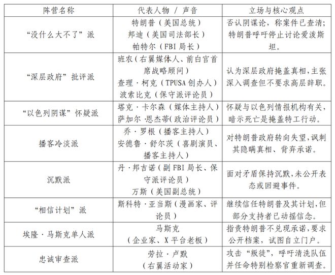 爱泼斯坦事件前所未有地分裂了MAGA运动,以上是美媒归纳的八个派系。资料来源:政治报