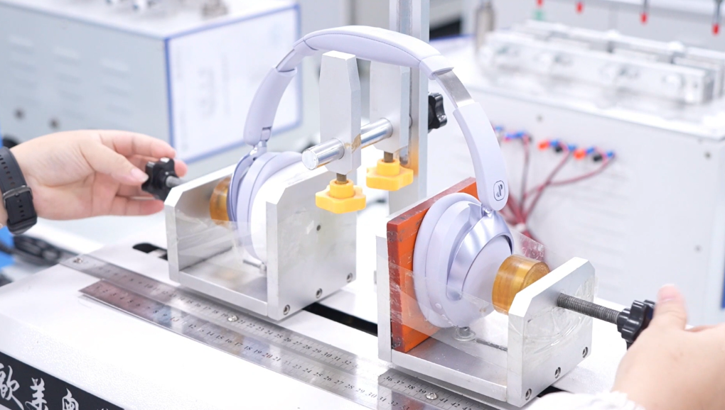 广东眷蜀科技有限公司车间内,员工对耳机产品进行技术检测。受访者供图